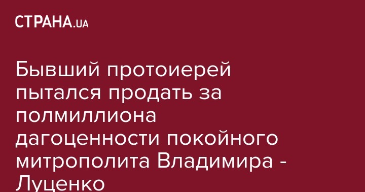 Прокуратура Киевской области задержала бывшего протоиерея, который пытался продать за 500 000 долларов старинные церковные реликвии, похищенные из дома личного помощника ныне покойного митрополита Владимира – Александра Драбинко. Реликвии принадлежали покойному предстоятелю Украинской православной церкви (Московского патриархата) митрополиту Владимиру (Сабодану). Об этом написал генеральный прокурор Украины Юрий Луценко на своей странице в Facebook.