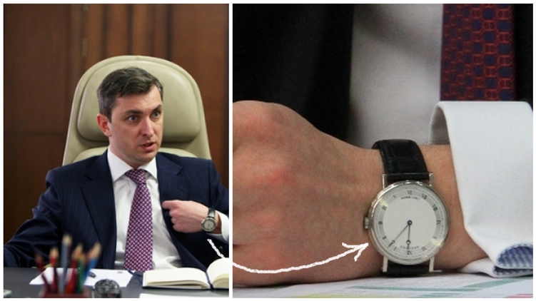 В частности, в декларации чиновника значатся часы Officine Panerai, Breguet, Reverso Jaeger-LeCoultre и A Lange & Sohne. Фотокорерспонденты "Страны" видели Билоуса в часах Breguet из белого золота и с ремешком из крокодильей кожи за $27 500 (на фото). У его супруги Марины имеются швейцарские часы Breguet и Audemars Piguet, а также три кольца, кулон и три пары сережек.