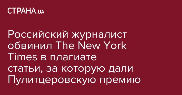 Журналист зарегистрированного в Латвии русскоязычного интернет-издания "Медуза" Даниил Туровский обвинил The New York Times в плагиате его статьи, за которую СМИ получило престижнейшую Пулитцеровскую премию. Об этом сообщает "Сноб".