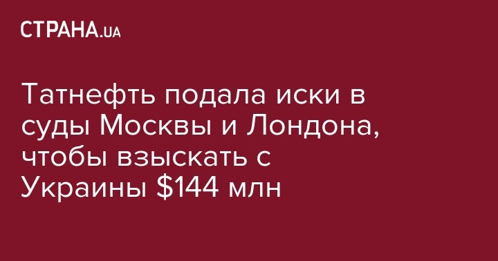 "Татнефть" подала ходатайства в Арбитражный суд Москвы и Высокий суд правосудия Лондона о принудительном исполнении арбитражного решения от 29 июля 2014 года, согласно которому Украина обязана выплатить компании $144 млн, сообщает пресс-служба "Татнефти".