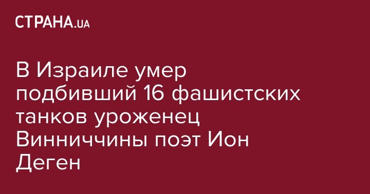В Израиле умер подбивший 16 фашистских танков уроженец Винниччины поэт Ион Деген