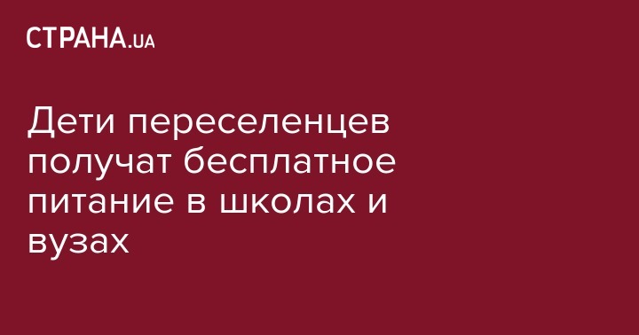 Сообщается, что дети из числа внутренних переселенцев, обучающиеся в дошкольных, общеобразовательных, профессионально-технических и высших учебных заведениях независимо от формы собственности обеспечиваются бесплатным питанием в порядке, установленном Кабинетом Министров.