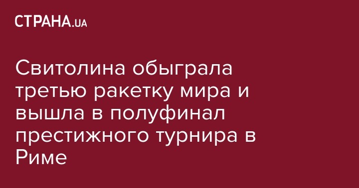 Первая ракетка Украины Элина Свитолина в четвертьфинале престижного турнира Женской теннисной ассоциации (WTA) серии Premier 5 в Риме (Италия) одержала победу над 3-м номером мировой классификации чешкой Каролиной Плишковой и вышла в полуфинал. Об этом сообщает пресс-служба турнира.