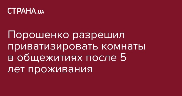 Президент Петр Порошенко подписал закон, разрешающий гражданам, проживающим по причине отсутствия собственного жилья длительное время (более 5 лет) на законных основаниях в общежитиях, после передачи этих общежитий в собственность объединенных территориальных общин бесплатно приватизировать помещения, в которых они проживают.