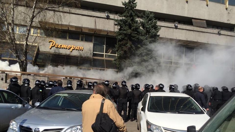 Пока люди в камуфляже пытались выяснить причины их выселения, силовики забросали их дымовыми шашками. После чего, всех "неплательщиков" в форме хаки с черными нашивками вывели из гостиницы. Как передает корреспондент "Страны" их более 20-ти человек.