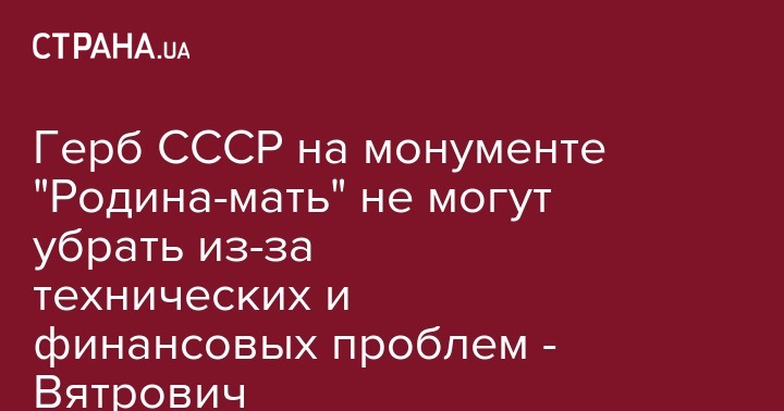 "Сейчас единственная проблема, которая на самом деле мешает устранению герба - это техническая проблема. То есть каким образом сделать это - срезанием или наложением чего-то, и, очевидно, финансовая, потому что это требует каких-то дополнительных ресурсов. Я надеюсь, что мы уже дойдем до практических инженерных решений и уже вскоре этот герб будут устранен со щита "Родины-матери". Тем более, что этот памятник является одной из визитных карточек Киева, и очень плохо, что это визитная карточка помечена тоталитарной символикой", - отметил Вятрович.