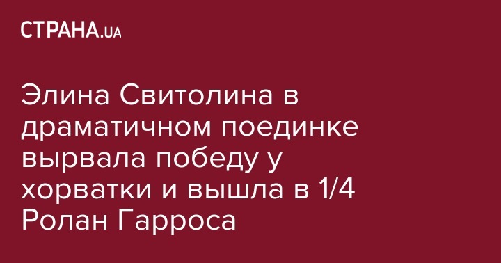 В Париже продолжается турнир Большого шлема - "Ролан Гаррос". В 1/8 финала украинка Элина Свитолина обыграла главную сенсацию турнира - 290-й ракетку мира Петру Мартич из Хорватии 4:6, 6:3, 7:5. Об этом сообщает Укринформ