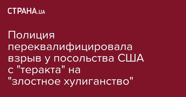 Он отметил, что после проведения дополнительного осмотра места происшествия на территории посольства США в Украине полиция усматривает в этом инциденте признаки уголовного правонарушения, предусмотренного ч. 4 ст. 296 (Хулиганство).