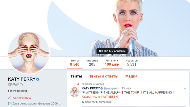 "Сегодня мы свидетели истории", – говорится в нем и отмечается, что певица первая собрала 100 млн фолловеров. Twitter в своем поздравлении использовал игру слов: "Свидетель" ("Witness") - название нового альбома Кэти Перри, который вышел в июне.