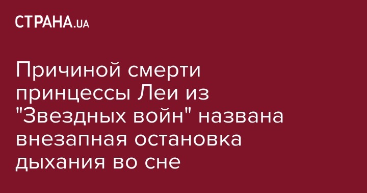 Названа причина смерти актрисы Керри Фишер, сыгравшей принцессу Лею в "Звездных войнах". Согласно отчету коронера, Фишер умерла во сне из-за апноэ во сне (прекращения легочной вентиляции во время сна) и "других факторов". Об этом сообщает ВВС.