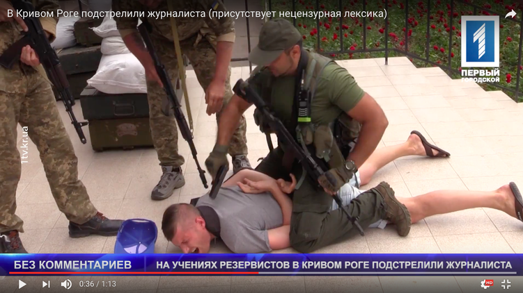 Телеканал опубликовал видеофрагмент, на котором Вячеслав Волк исполняет роль провокатора. На видеокадрах видно, как военные делают предупредительный выстрел в небо, поваливают фотографа на землю, заламывают руки и ноги, хватают за волосы и резко дергают голову назад. После этого руки "провокатора" связывают пластиковой веревкой. Все это время на журналиста наставлен пистолет.