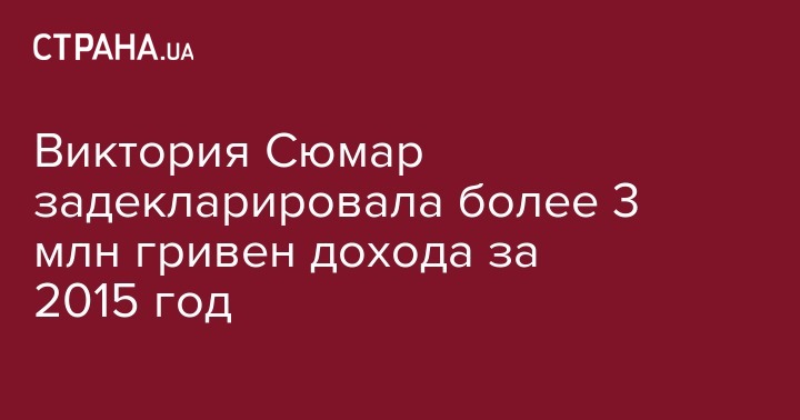 Депутат от "Народного фронта" Виктория Сюмар за 2015 получила доход в размере 2 млн 47 тысяч гривен дохода, доходы ее семьи за тот же период (имеется в виду ее супруг политолог Виктор Таран) составили 1 млн 14 тысяч гривен, передает "Украинская правда".