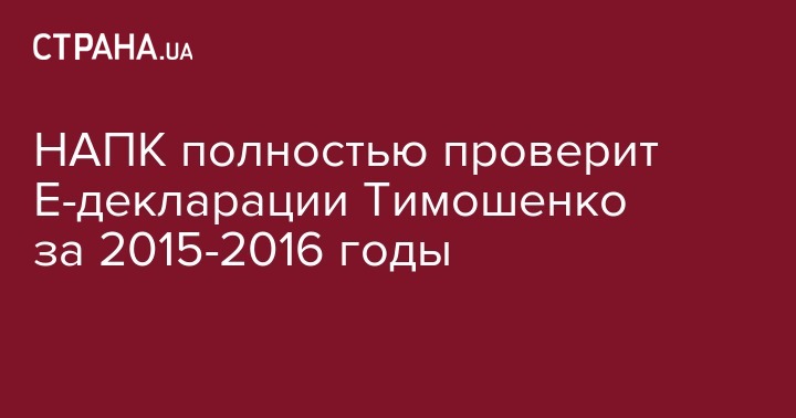 Национальное агентство по предотвращению коррупции (НАПК) начало полную проверку электронных деклараций лидера партии "Батькивщина" Юлии Тимошенко за 2015 и 2016 годы.