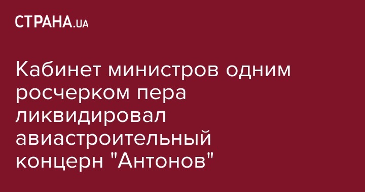 Кабинет министров ликвидировал государственный авиастроительный концерн "Антонов". Об этом свидетельствует соответствующее постановление правительства от 19 июля 2017 года № 546.