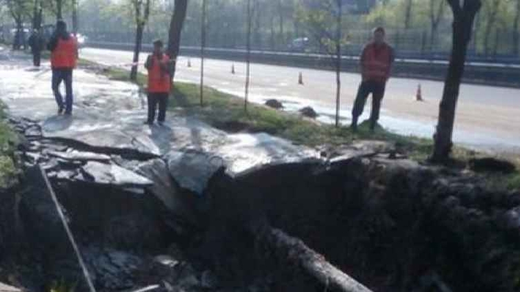 Из-за аварии в тротуаре образовалась яма размером 5 на 5 метров, которая заполнена водой. Последствия аварии ликвидирует рабочая бригада ДЭУ Соломенского района.