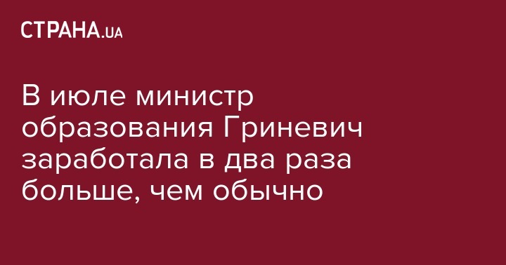 Зарплата министра образования и науки Лилии Гриневич за июль составила 76,7 тыс. гривен, ее заместителей - от 31,8 тыс. до 75,3 тыс. гривен, госсекретаря министерства - 35,3 тыс. гривен. Об этом говорится в ответе Министерства образования и науки на запрос "Украинских новостей".