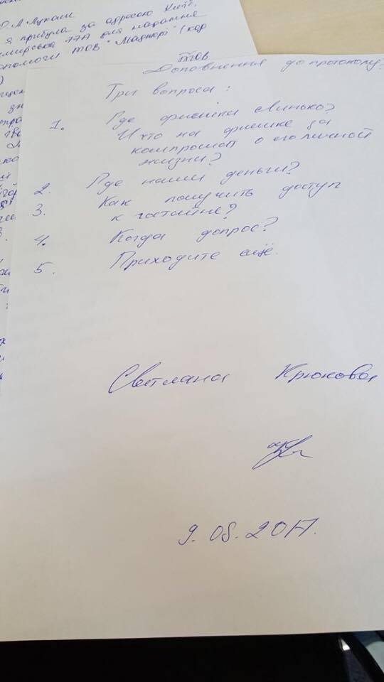 13:02 "Как получить доступ к гостайне?" Заместитель главного редактора "Страны" Светлана Крюкова на протоколе обыска сформулировала четыре вопроса и одно пожелание к СБУ.