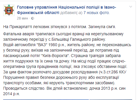В Ивано-Франковской области на нерегулируемом железнодорожном переезде в селе Бильшивци поезд врезался в автомобиль, в результате чего погибла супружеская пара с двумя детьми. Об этом сообщает пресс-служба местной полиции в Facebook.