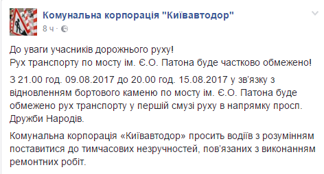 "С 21:00 09.08.2017 до 20:00 15.08.2017 в связи с восстановлением бортового камня по мосту им. Е.О. Патона будет ограничено движение транспорта в первой полосе движения в направлении просп. Дружбы Народов", - говорится в сообщении. "Киевавтодор" просит водителей с пониманием отнестись к временным неудобствам, связанным с выполнением ремонтных работ.