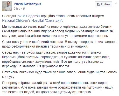 "Именно поэтому у Ирины особый контракт. В нем есть перечень четких задач по реформированию больницы со сроками их выполнения. Среди них - автономизация больницы, внедрение госпитальной информационной системы, внедрение современных клинических протоколов, перестройка системы закупок лекарств. Все это подготовит больницу к переходу на заказ государством услуг", - написал Ковтонюк.
