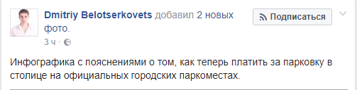 Советник мэра Киева по вопросам благоустройства Дмитрий Белоцерковец опубликовал в Facebook инфографику-инструкцию по безналичной оплате парковки в столице.