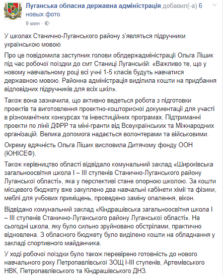 В новом учебном году все школьники 1-5 классов Станично-Луганского района будут учиться на украинском языке. Об этом сообщила зампредседателя Луганской ОГА Ольга Лишик, говорится на странице Луганской ОГА в Facebook.
