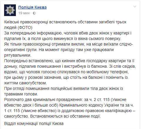 По факту происшествия начаты два уголовных производства: по ч. 2 ст. 115 (умышленное убийство двух и более лиц) Уголовного кодекса Украины и по ч. 1 ст. 115 (умышленное убийство) с дополнительной правовой квалификацией – самоубийство.
