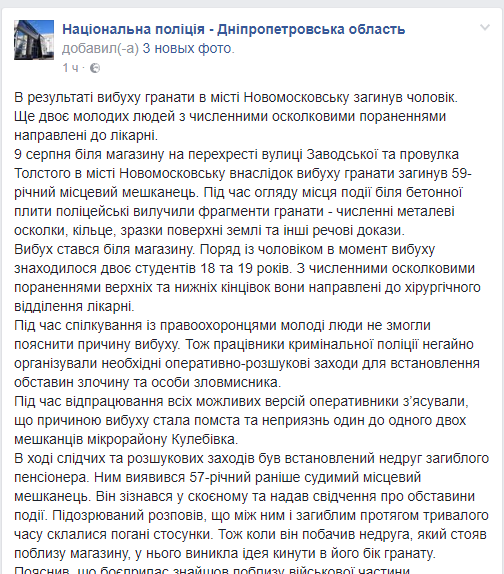 В Новомосковске Днепропетровской области от взрыва гранаты погиб человек, еще двое молодых людей с многочисленными осколочными ранениями направлены в больницу. Об этом сообщает пресс-служба местной полиции в Facebook.