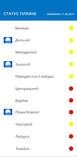 "Красный" статус на сегодня у пляжей "Центральный", "Вербное", "Радуга", "Тельбин" и "Пуща Водица". Здесь купаться запрещено. На пляжах "Венеция", "Детский", "Молодежный", "Золотой", "Предместная Слободка" и "Чорторый" вывешены желтые флаги – здесь купаться не рекомендуется.