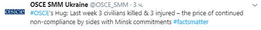 "На прошлой неделе трое гражданских лиц погибли и трое получили ранения - цена несоблюдения сторонами Минских договоренностей", - заявил заместитель председателя СММ ОБСЕ в Украине Александр Хуг.