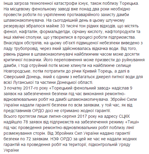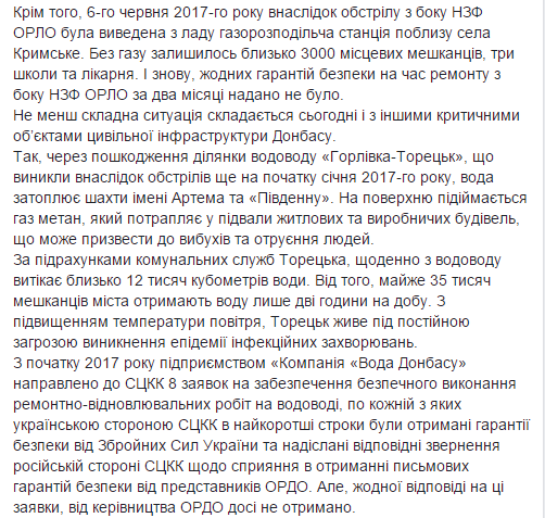 По подсчетам коммунальных служб Торецка, ежедневно с водовода вытекает около 12 тысяч кубометров воды, из-за чего почти 35 тысяч жителей города получат воду только 2 часа в сутки. Как указывается в сообщении, "с повышением температуры воздуха, Торецк живет под постоянной угрозой возникновения эпидемии инфекционных заболеваний". При этом в Общий центр координации и контроля направлено 8 заявок на обеспечение безопасности для проведения ремонта, но "ни одного ответа на эти заявки, от руководства ОРДО до сих пор не получено".