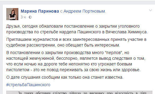 Сегодня адвокаты обжаловали постановление о закрытии уголовного производства по делу о стрельбе депутата Сергея Пашинского в Вячеслава Химикуса. Об этом сообщила адвокат Вячеслава Химикуса Марина Паринова на своей странице в социальной сети Facebook.