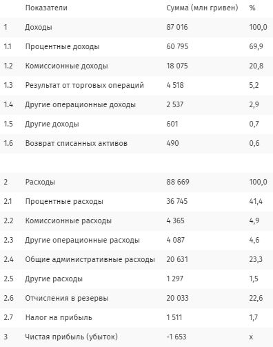 Из 90 платежеспособных состоянию на 1 июля 2017 года банков 70 банков по итогам 1-го полугодия были прибыльными и получили чистую прибыль в размере 8,22 млрд гривен, 20 банков - убыточными с совокупным чистым убытком в 10,07 млрд гривен.