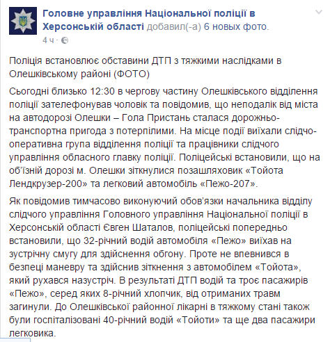Полицейские установили, что на объездной дороге города Олешки столкнулись автомобили Toyota Land Cruiser 200 и Peugeot 207. Полицейские предварительно установили, что 32-летний водитель автомобиля Peugeot выехал на встречную полосу для совершения обгона. Однако не убедился в безопасности маневра и совершил столкновение с автомобилем Toyota, двигавшемся навстречу. В результате ДТП водитель и 3 пассажира Peugeot, среди которых 8-летний мальчик, погибли от полученных травм.
