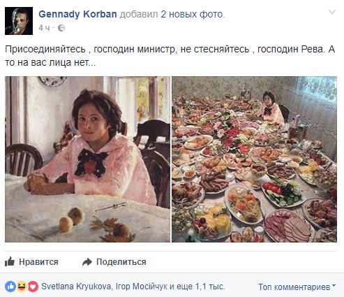 Днепровский политик Геннадий Корбан показал министру фотожабу на известную картину "Девочка и персики", пригласив чиновника присоединиться к застолью.