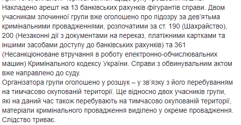 Наложен арест на 13 банковских счетов фигурантов дела. Двум участникам преступной группы уже объявлено о подозрении по девяти уголовным производствами, начатыми по ст. 190 (мошенничество), 200 (Незаконные действия с документами на перевод платежными карточками и другими средствами доступа к банковским счетам) и 361 (Несанкционированное вмешательство в работу электронно-вычислительных машин) Уголовного кодекса Украины. Дела с обвинительными актами уже направлено в суд.