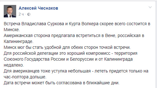 "Встреча Владислава Суркова и Курта Волкера, скорее всего, состоится в Минске", - написал он.