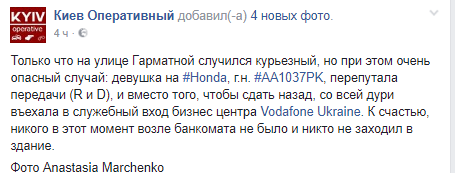 ДТП произошло на улице Гарматной. По версии ресурса, причиной послужило то, что девушка-водитель перепутала передачи (R и D), и вместо того, чтобы сдать назад, въехала в служебный вход бизнес центра Vodafone Ukraine.