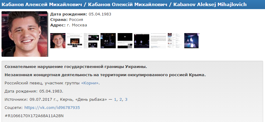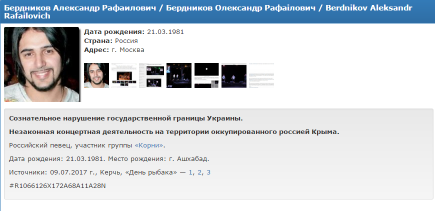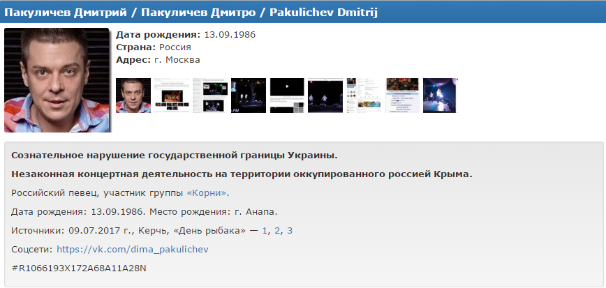 В список добавлены Дмитрий Пакуличев, Алексей Кабанов и Александр Бердников. Их имена внесены в базу данных в связи с "сознательным нарушением государственной границы Украины" и "незаконной концертной деятельностью" в Крыму.