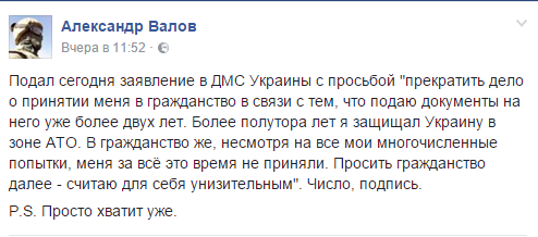 "Подал сегодня заявление в ГМС Украины с просьбой "прекратить дело о принятии меня в гражданство в связи с тем, что подаю документы на него уже более двух лет. Более полутора лет я защищал Украину в зоне АТО. В гражданство же, несмотря на все мои многочисленные попытки, меня за всё это время не приняли. Просить гражданство далее - считаю для себя унизительным". Число, подпись. Просто хватит уже", - написал он.