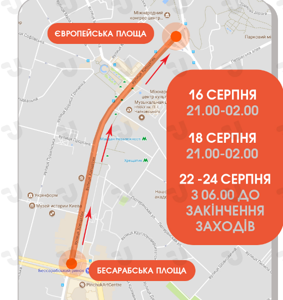 Также ограничения движения в центре Киева будут 18 и 22-24 августа. Они коснутся участка от Бессарабской до Европейской площади.