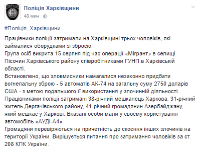 По сведениям полиции, мужчины пытались незаконно приобрести огнестрельное оружие - 5 автоматов АК-74 на общую сумму $2750 с целью дальнейшего его использования в преступной деятельности.