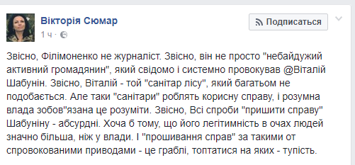"Конечно, Филимоненко не журналист. Конечно, он не просто "неравнодушній активный гражданин", который сознательно и системно провоцировал Виталия Шабунина. Конечно, Виталий - тот "санитар леса", который многим не нравится. Но все-таки "санитары" делают полезное дело, и умная власть должна это понимать. Конечно, все попытки "пришить дело" Шабунину - абсурдны. Хотя бы потому, что его легитимность в глазах людей значительно больше, чем у власти. И "пришивка дел" по таким вот спровоцированными предлогами - это грабли, топтаться на которых - тупость", - заявила Сюмар.