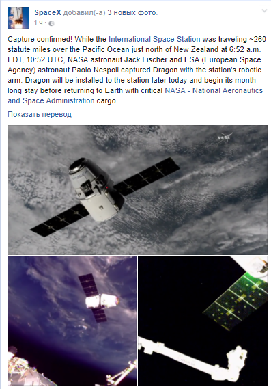 Космический корабль Dragon доставил на Международную космическую станцию 3 тонны исследовательского оборудования. Об этом сообщает SpaceX на странице в Facebook