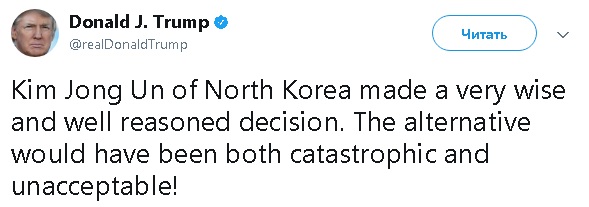 "Ким Чен Ын из Северной Кореи принял очень мудрое и хорошо обоснованное решение. Альтернатива была бы катастрофической и неприемлемой!" - написал президент США.