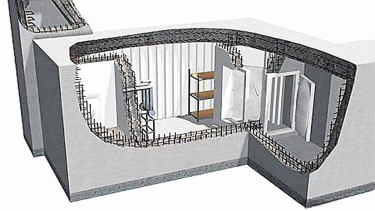 Самый обычный способ постройки бункера: вырывается котлован, ставится герметичная железная коробка и все затем заливается бетоном. Можно залить в толщину от полуметра до двух метров. А если переживаете за радиацию, в случае ядерного удара, то можно защититься еще и свинцовыми плитами, которые "тормозят" излучение.