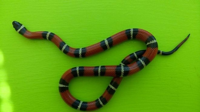 Сначала ее приняли за ядовитого кораллового аспида. При детальном рассмотрении специалисты выяснили, что это неядовитая королевская молочная змея.