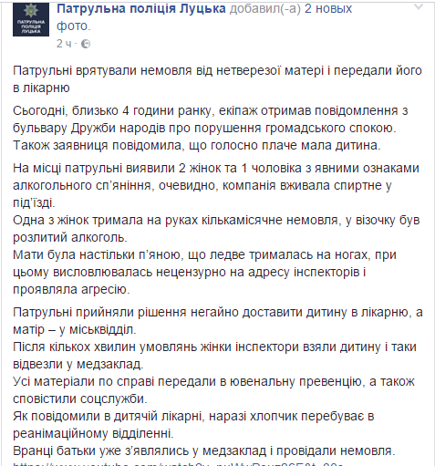 В Луцке полуторамесячный младенец, которого патрульные забрали посреди улицы у пьяной матери, находится в реанимации с признаками интоксикации.