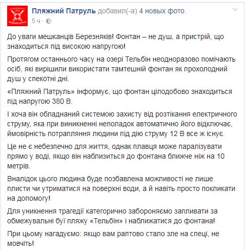 В Киеве на озере Тельбин (Березняки) люди используют в качестве душа фонтан, который круглосуточно находится под напряжением 380 В.