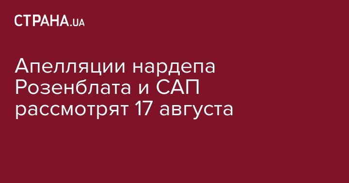 "Завтра, 17 августа 2017 года, в 10:15 в помещении Апелляционного суда города Киева состоится рассмотрение апелляционной жалобы народного депутата Борислава Розенблата на постановление относительно избрания ему меры пресечения Соломенским районным судом города Киева", - отмечается в сообщении.